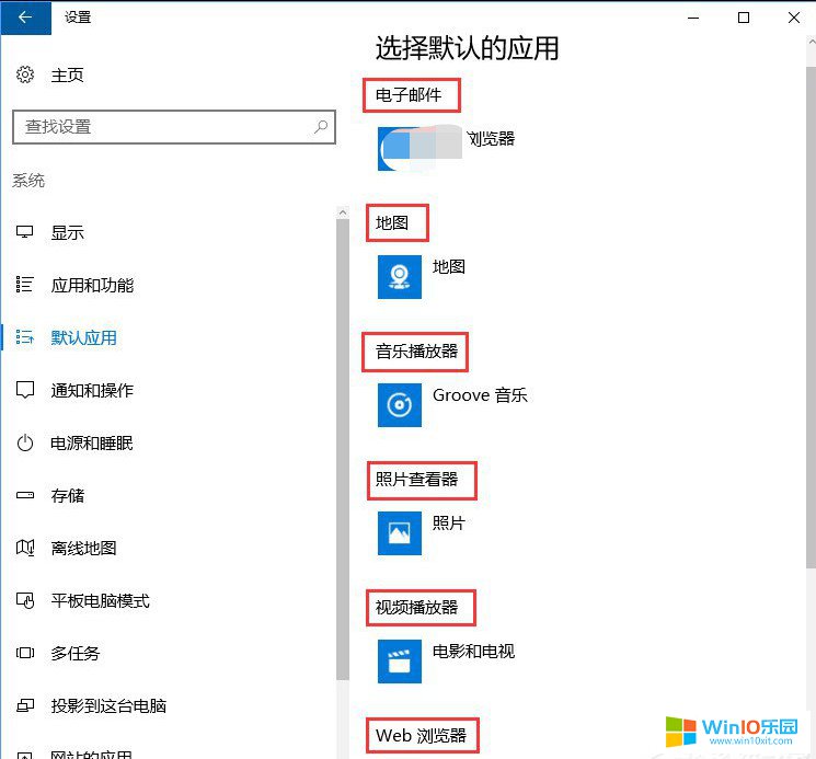6、在默認應用相匹配右邊對話框,大家還能夠設定電子郵箱、地形圖、音頻播放器、照片查看器和視頻播放軟件等(在其中地形圖、音頻播放器、視頻播放軟件是默認設置系統設定,大家還可以變更設置)。